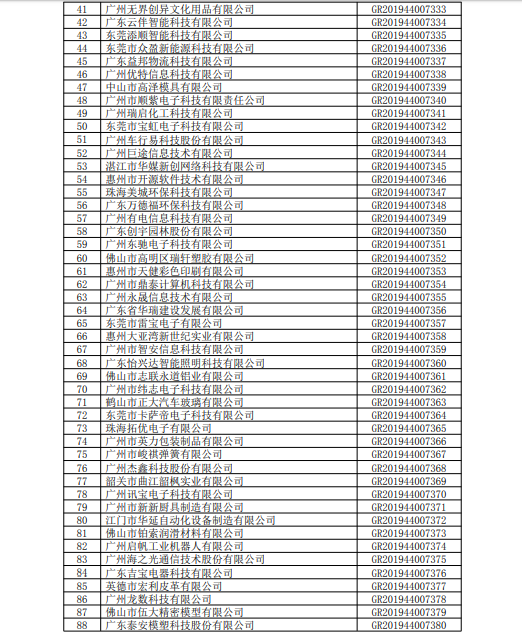 你們上報的《關于廣東省2019年高新技術企業認定備案的函》(粵科函高字〔20191730號)收悉。現將公示無異議的橫琴小胖胖新媒體有限公司等3236家企業予以高新技術企業備案。請你們按照《廣東省2019年第三批高新技術企業名單》(詳見附件)中的企業名稱、高新技術企業證書編號和發證日期打印并頒發“高新技術企業證書”。