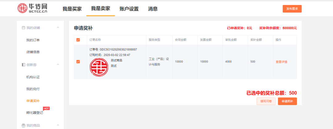 服務(wù)機(jī)構(gòu)登錄后,可在【用戶(hù)中心】--【我是賣(mài)家】---【申請(qǐng)獎(jiǎng)補(bǔ)】對(duì)已兌付的訂單申請(qǐng)獎(jiǎng)補(bǔ)。